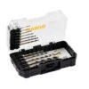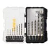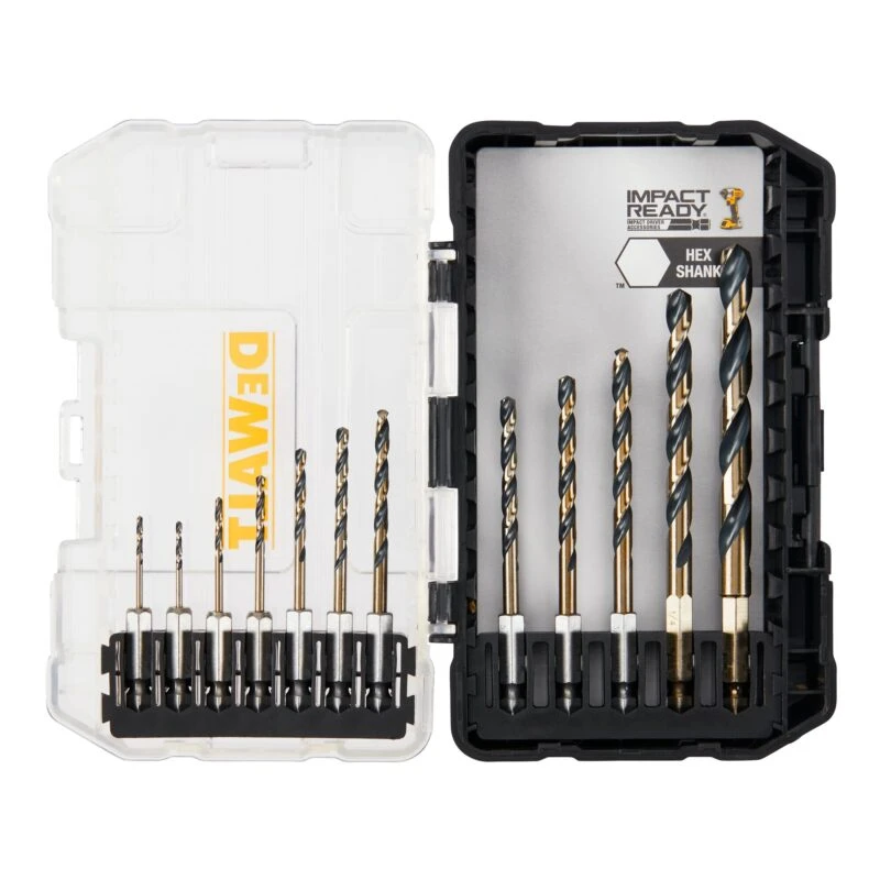 The 12 pc. BLACK & GOLD IMPACT READY® Metal Drill Bit Set is rust-resistant, with a strong tapered core design that helps resist breakage. Made of heavy-duty, high-speed steel for drilling into a variety of materials including plastic, wood, and metal, each bit features a 1/4 in. hex shank designed to resist axial torque with impact drivers. The 135° split point tip design on 1/8 in. and larger sizes helps reduce walking. The 12 pc. set comes in a durable ToughCase®+ system which is designed to optimize storage space and keep your bits organized. The patented bit-bar design allows for easy bit removal, with a clear lid so you can see what”s inside at a glance.