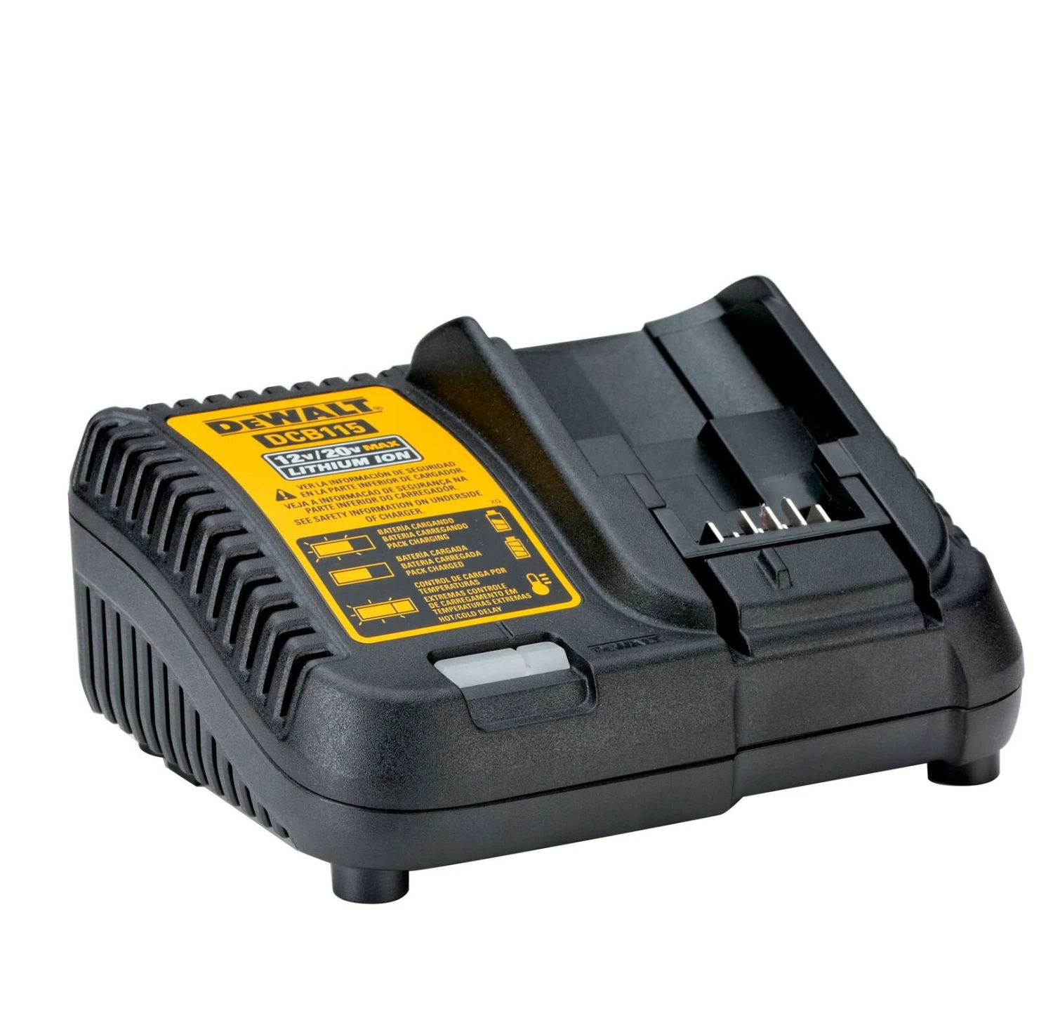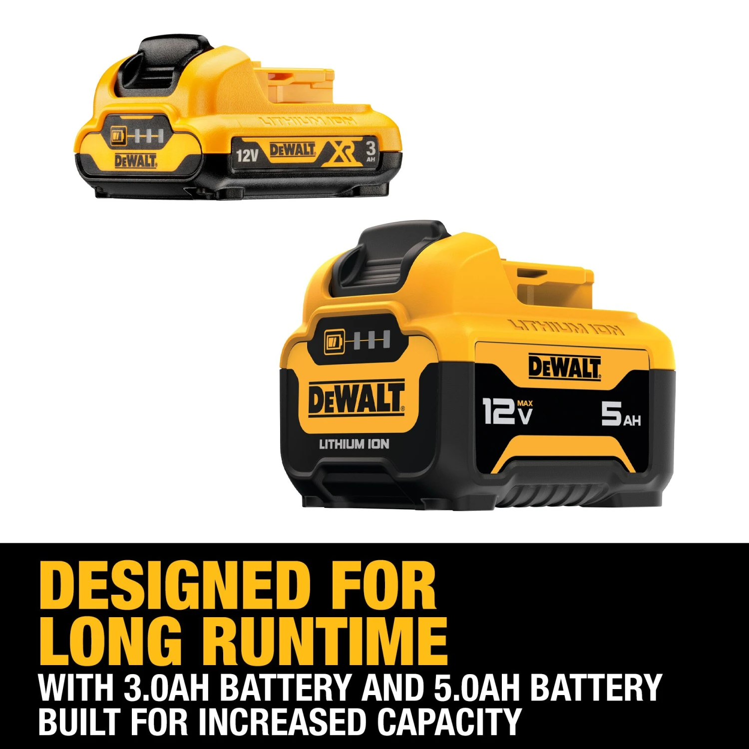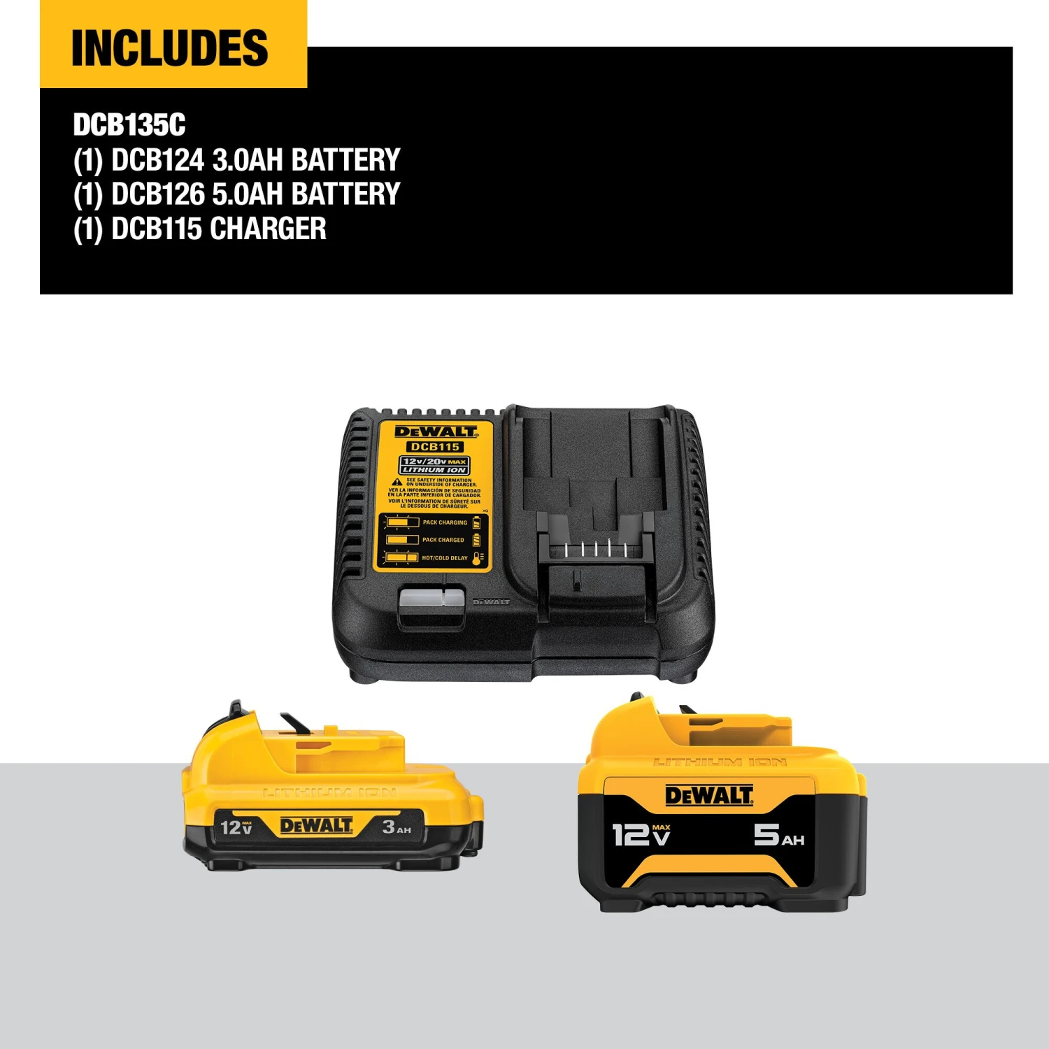 Get the most out of your 12V MAX* tools on the jobsite with this 12V MAX* Battery Starter Kit. The kit includes 2 high-capacity 12V MAX* batteries—one 5.0Ah (DCB126) and one 3.0Ah (DCB124). Both batteries are lightweight, compact, and designed to deliver long runtime. Keep aware of the state of charge of each battery and avoid unplanned work stoppages using their built-in LED fuel gauge indicators. Engineered to help minimize charge time, the included DCB115 charger fuels your batteries quickly with its 4 Amp charge rate. The charger is wall-mount capable and compatible with all DEWALT® 12V MAX*, 20V MAX*, and FLEXVOLT® batteries.