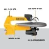 On-off switch, electronic variable speed, flexible dust blower, and blade-tensioning lever are all located on the front upper arm