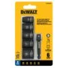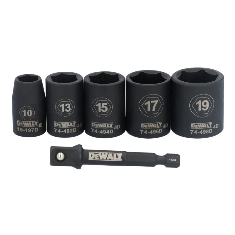The DEWALT® 3/8-in drive socket set includes the five most common size Metric sockets and one 1/4-in adapter. These sockets are made of high impact resistant material for durability, and have recessed corners that distribute torque across flats, promoting life of the socket. The sockets also feature large laser etched markings that make each socket easily identifiable, and are thinner than pneumatic wrench sockets for tough to access areas.