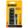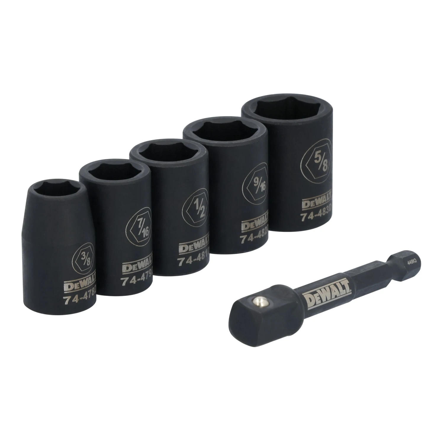 The DEWALT® 3/8-in drive socket set includes the five most common size SAE sockets and one 1/4-in adapter. These sockets are made of high impact resistant material for durability, and have recessed corners that distribute torque across flats, promoting life of the socket. The sockets also feature large laser etched markings that make each socket easily identifiable, and are thinner than pneumatic wrench sockets for tough to access areas.
