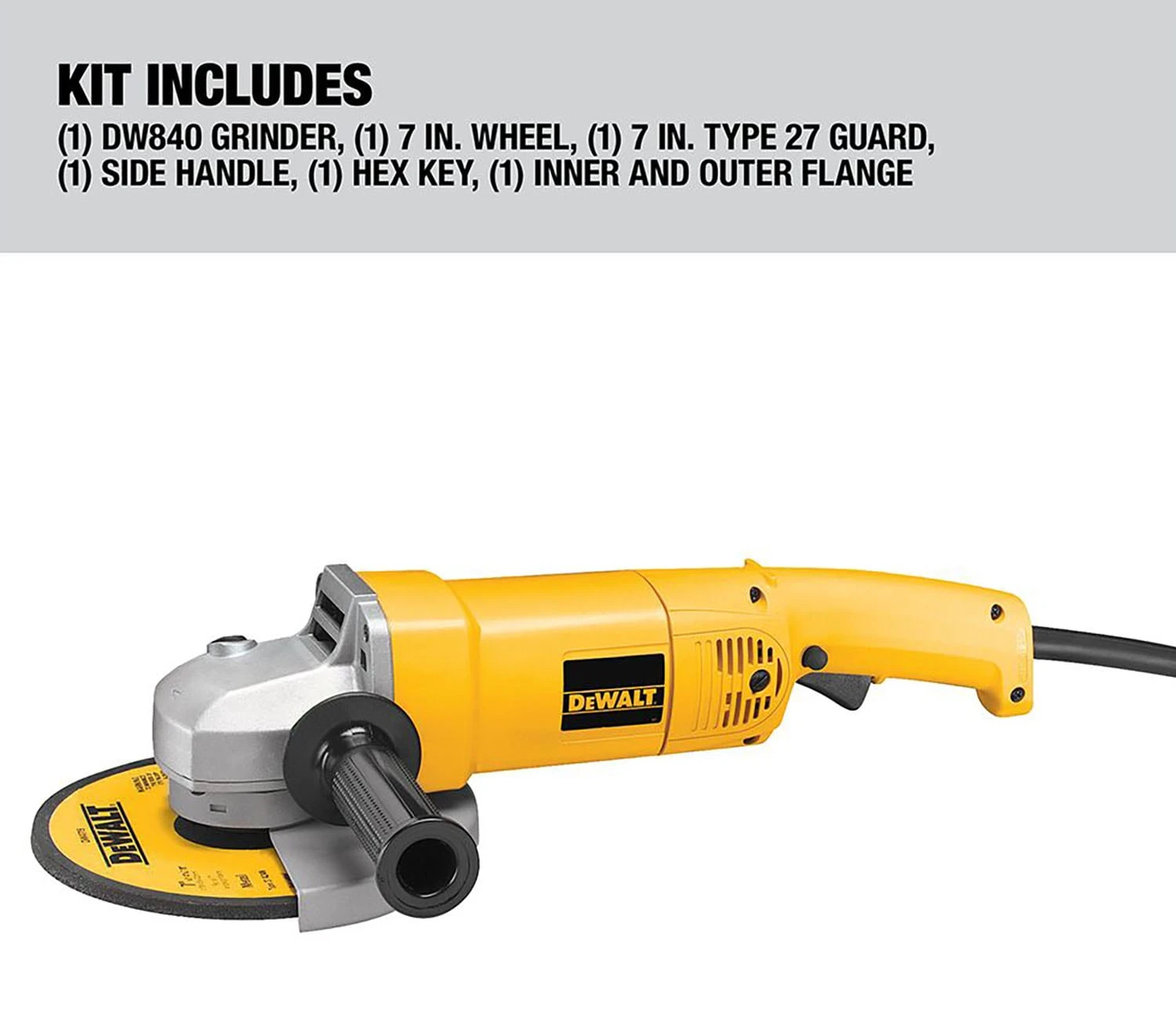 | Package Contents | Medium angle grinder, grinding wheel, wrench, backing flange, clamp nut, adjustable guard, and 2-position side handle |