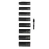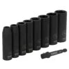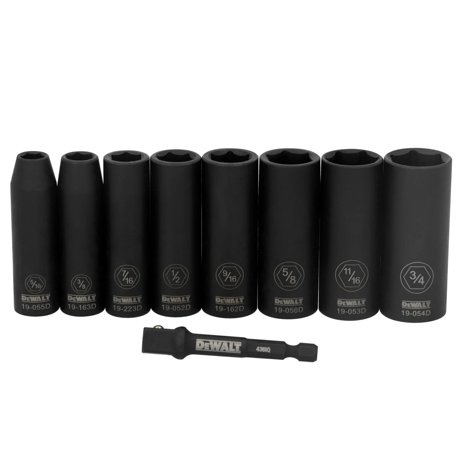 The DEWALT® 3/8-in drive socket set includes the eight most common size SAE sockets and one 1/4-in adapter. These sockets are made of high impact resistant material for durability, and have recessed corners that distribute torque across flats, promoting life of the socket. The sockets also feature large laser etched markings that make each socket easily identifiable, and are thinner than pneumatic wrench sockets for tough to access areas.