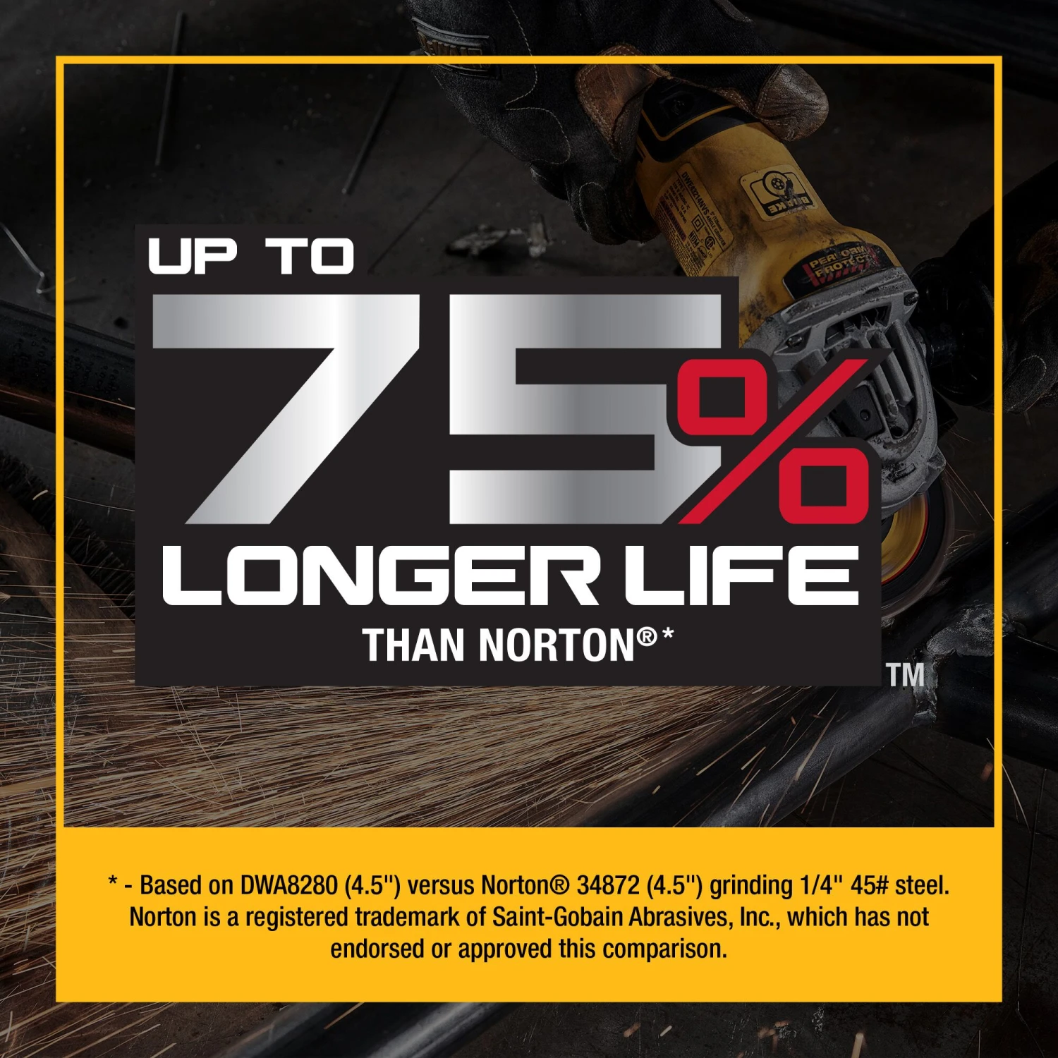 Engineered to Last – High quality ceramic grain allows DEWALT ELITE SERIES™ DWA8280 Flap Disc to last up to 75% longer than Norton flap disc (Based on DWA8280 (4.5-in versus Norton® 34872 (4.5-in) grinding 1/4-in 45# steel, Norton is a registered trademarks of Saint-Gobain Abrasives, Inc, which has not endorsed or approved this comparison