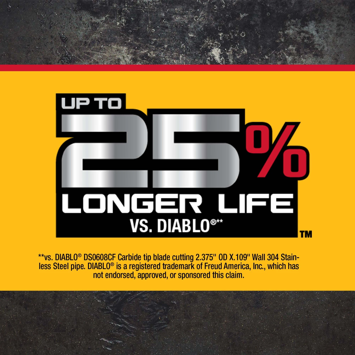 Versus DIABLO; DS0608CF carbide tip blade cutting 2.375-in OD X 0.109-in Wall 304 Stainless Steel pipe, DIABLO is a registered trademark of Freud America, Inc, which has not endorsed, approved, or sponsored this comparison