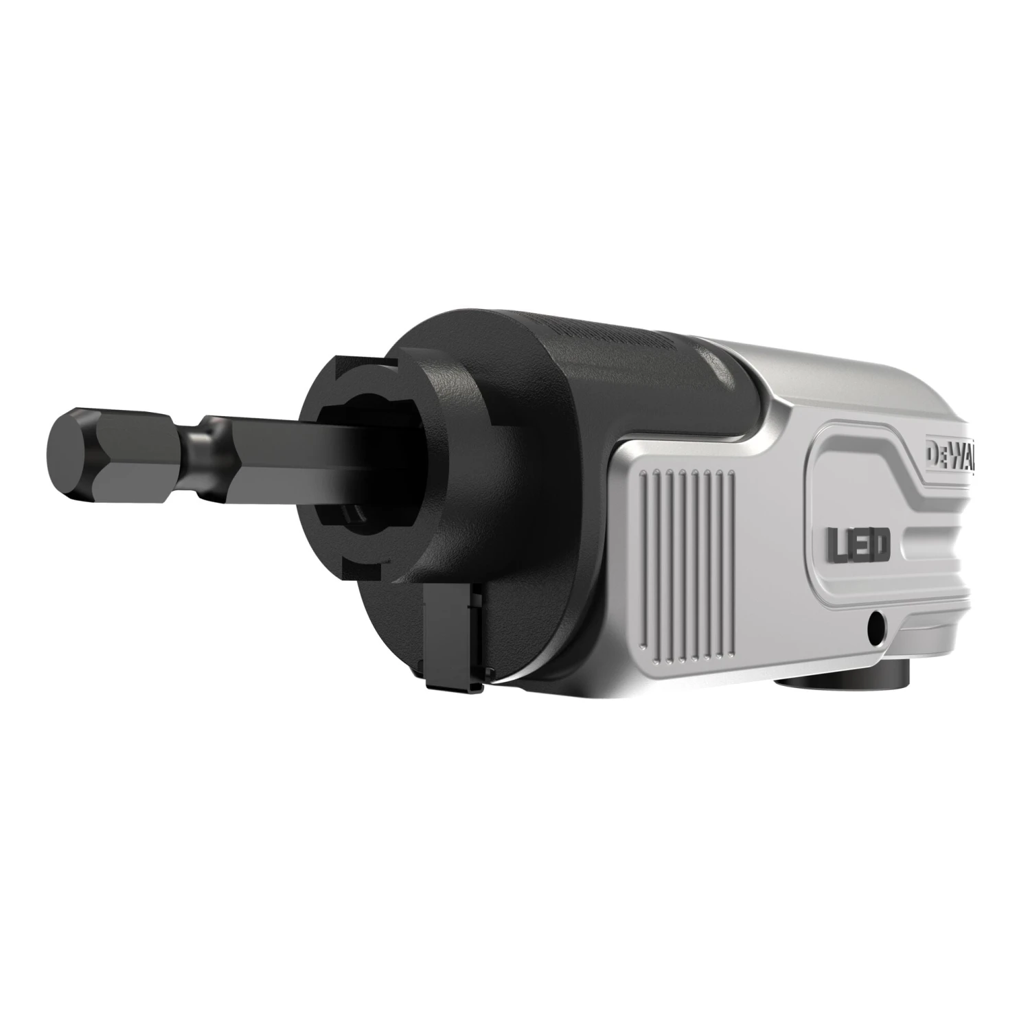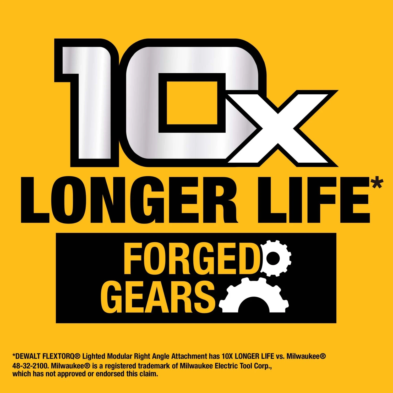 Illuminate workspaces and take on challenging jobs with the FLEXTORQ® Lighted Modular Right Angle Attachment. Engineered with forged gears for durability, this dual-function DEWALT® accessory delivers 10X longer life* in for tough applications. Featuring an ultra-bright LED and 1.5 in. head height, this Modular Right Angle attachment offers maneuverability and additional visibility in confined areas.