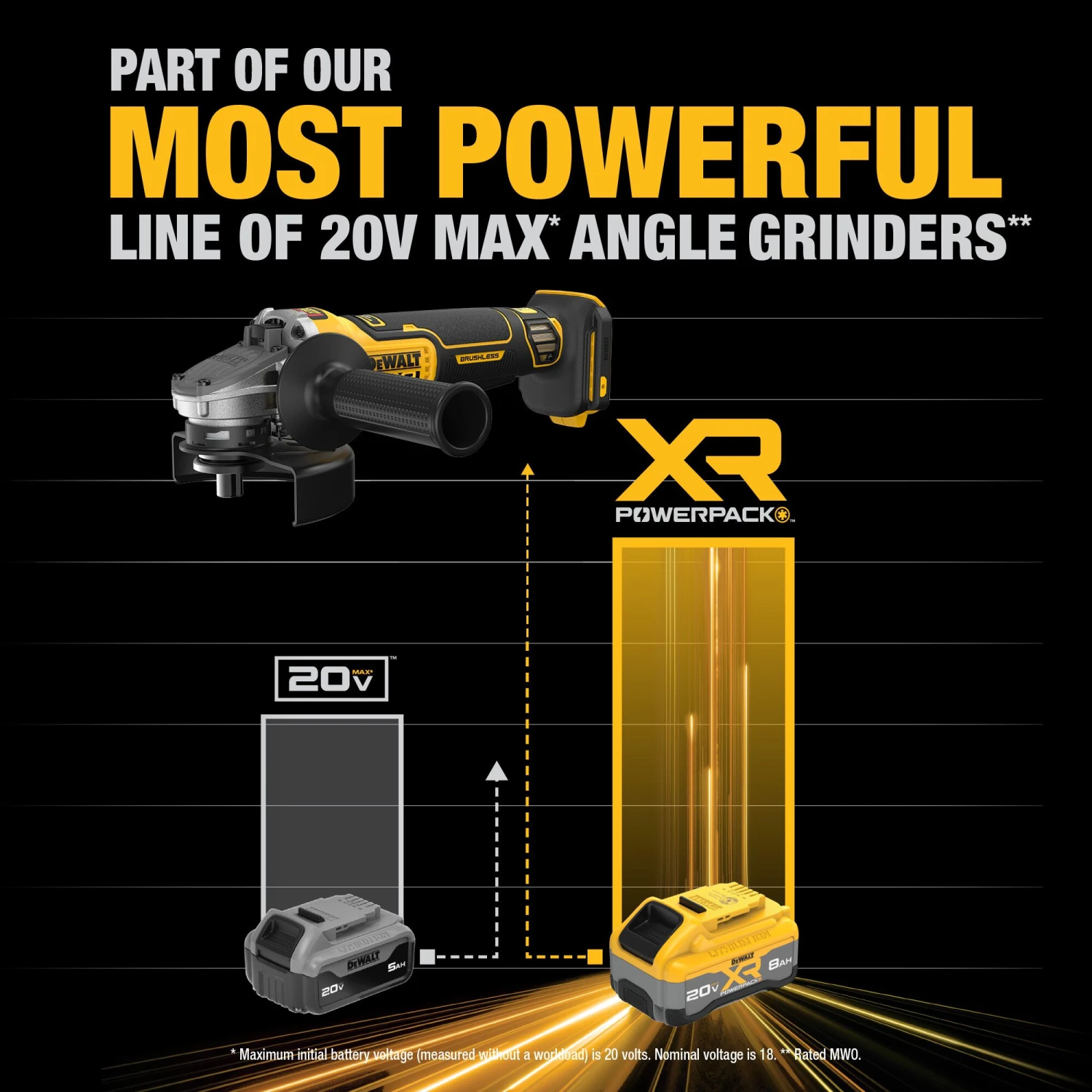 | Package Contents | DCG410 XR Angle Grinder, DCB2108 XR POWERPACK 8 Ah Battery, 5-in (125 mm) Type 27 Guard, Fast Charger, Side Handle, Wrench, Inner and Outer Flange |